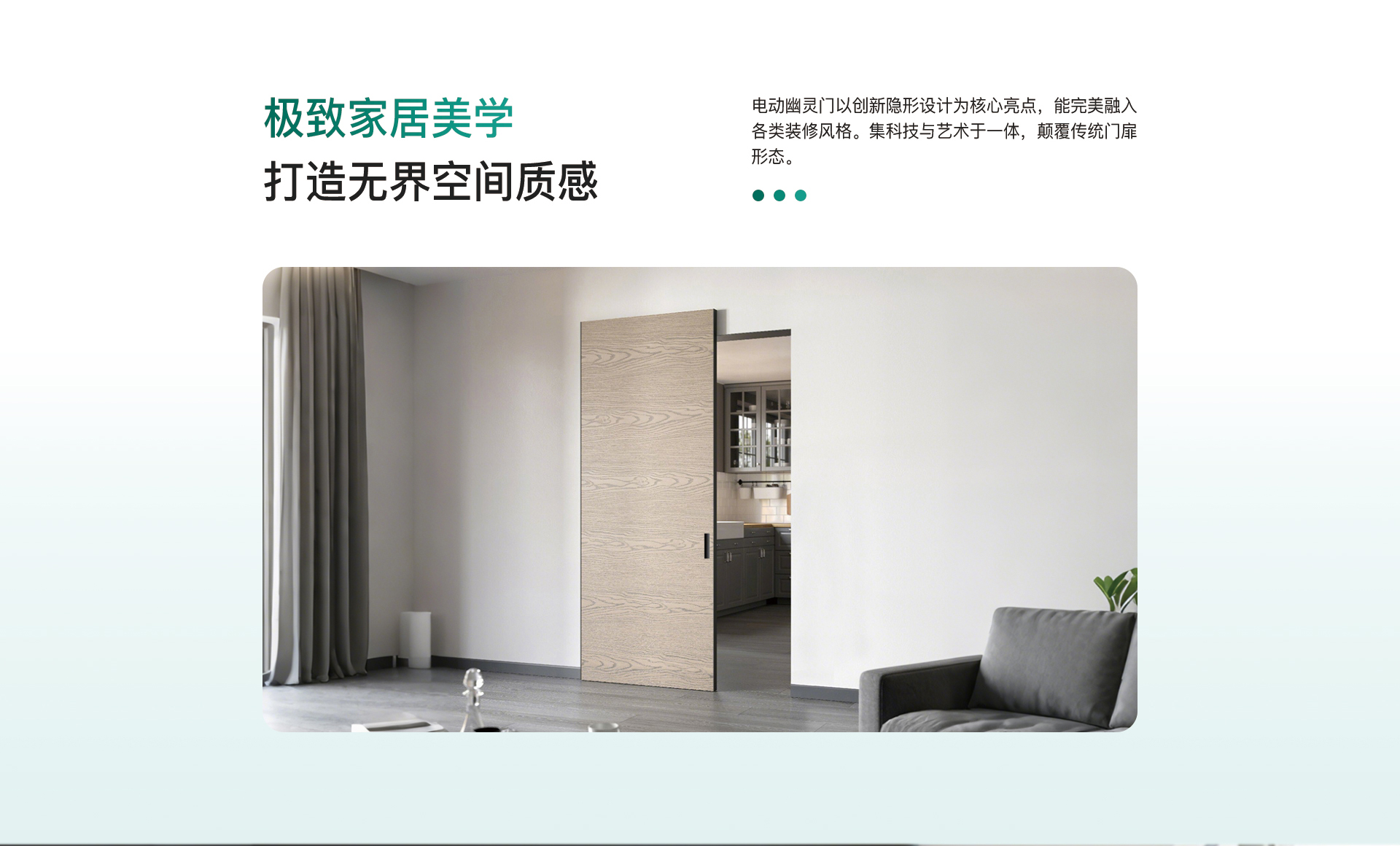 集科技与艺术于一体,颠覆传统门扉形态。其创新隐形设计,于无形中演绎空间的灵动变幻,一键启动,顷刻化为通透视界。电动幽灵门以其超凡智能与极致美学,为现代生活注入无尽惊喜与高雅格调。无论是高档别墅、豪华酒店还是顶级办公环境,电动幽灵门都能以其独特的存在感,为整体空间增添一抹神秘而高雅的气息。
