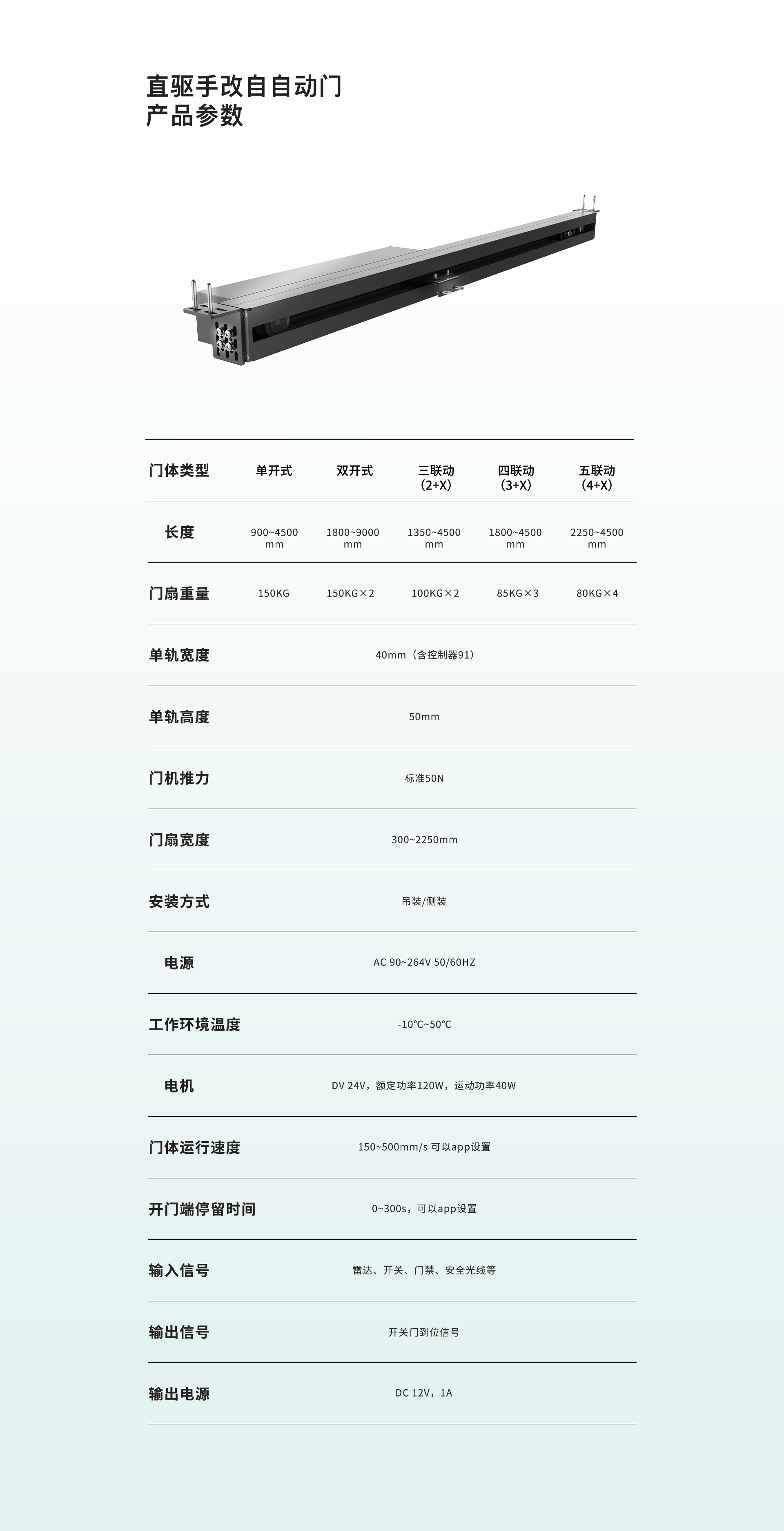 门机长度2.5m~12m,1套电机,钢丝绳联动双开智能自动门